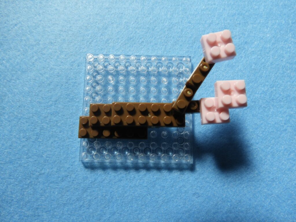 7.上記で組み立てたブロックを長い茶色ブロックの上にのせると工程6番は完成します。