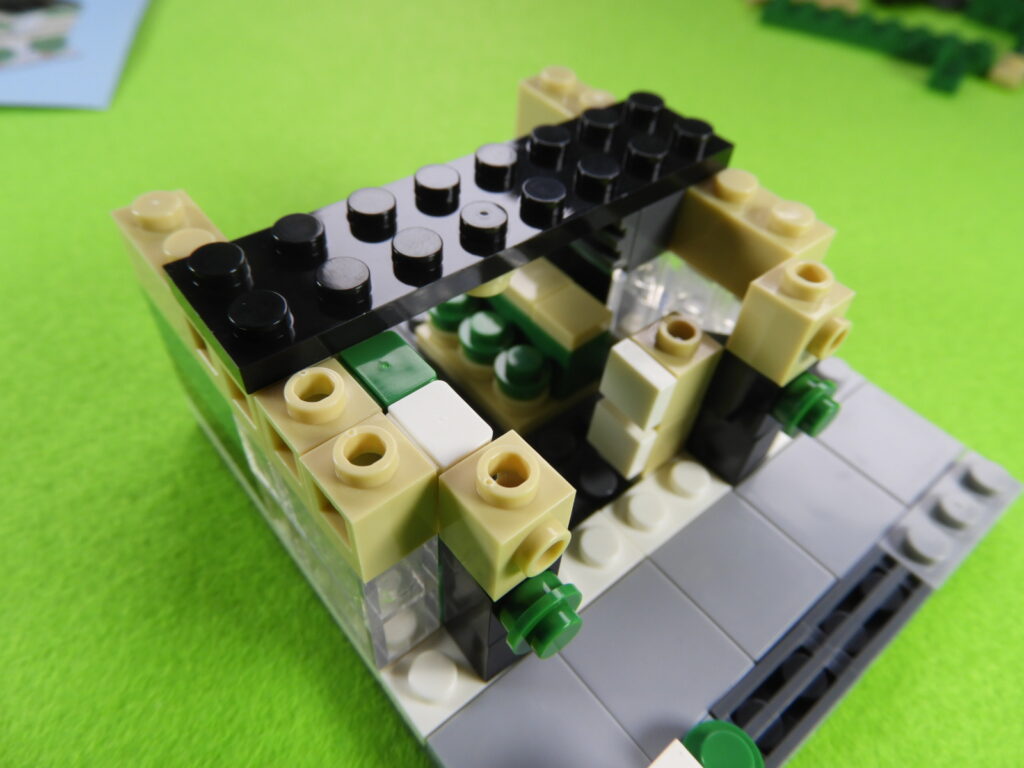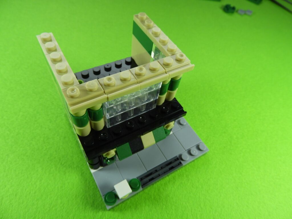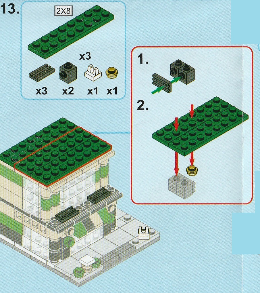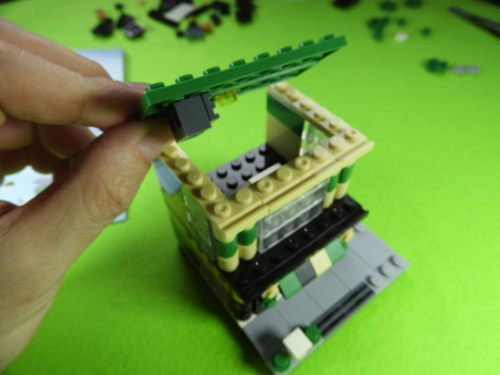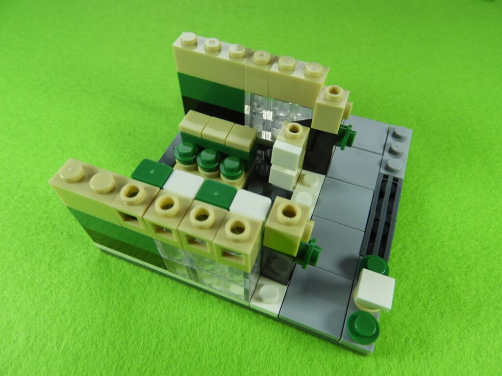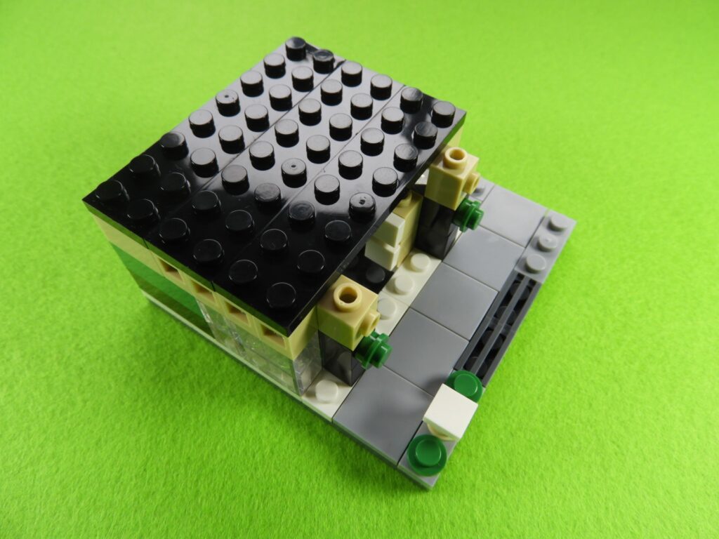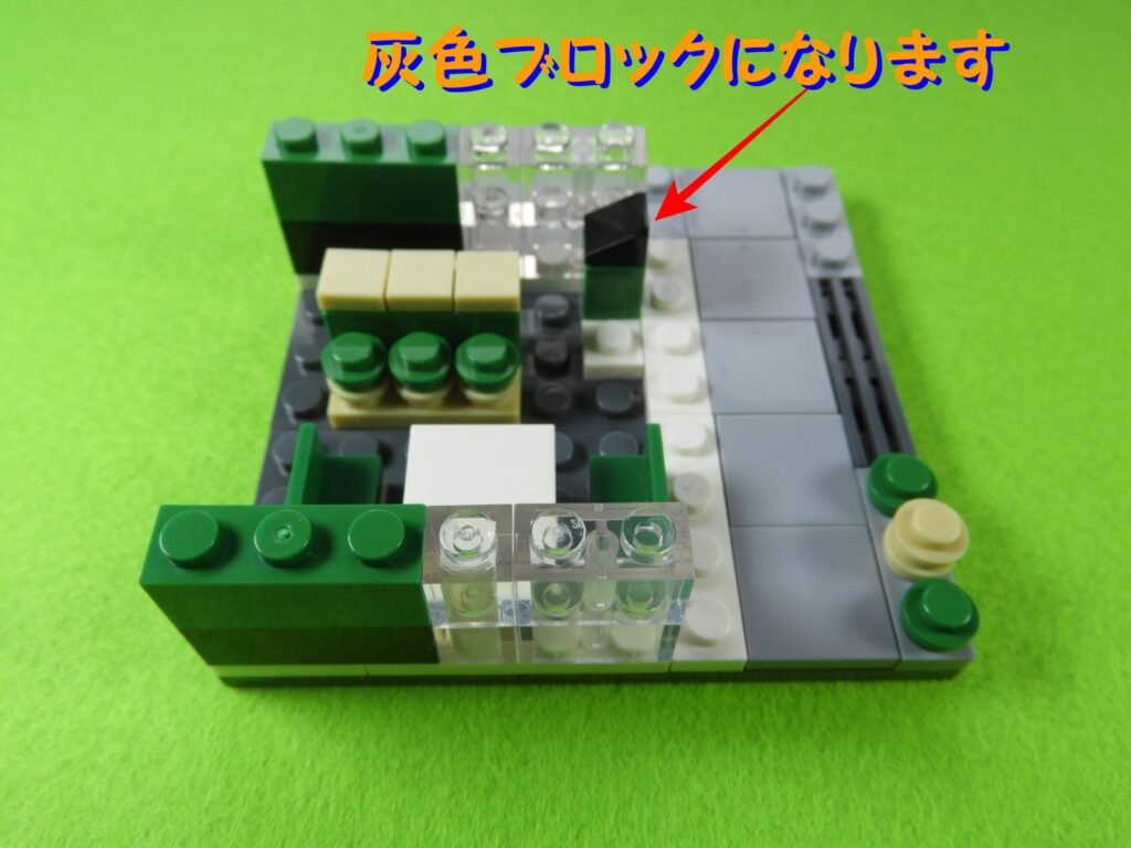 2.上記で組み立てたブロックをこの向きにして取り付けます。建物の正面側に上記で組み立てたブロックをのせます。最後に残り1枚の緑ブロックをのせると工程13番は完成します。