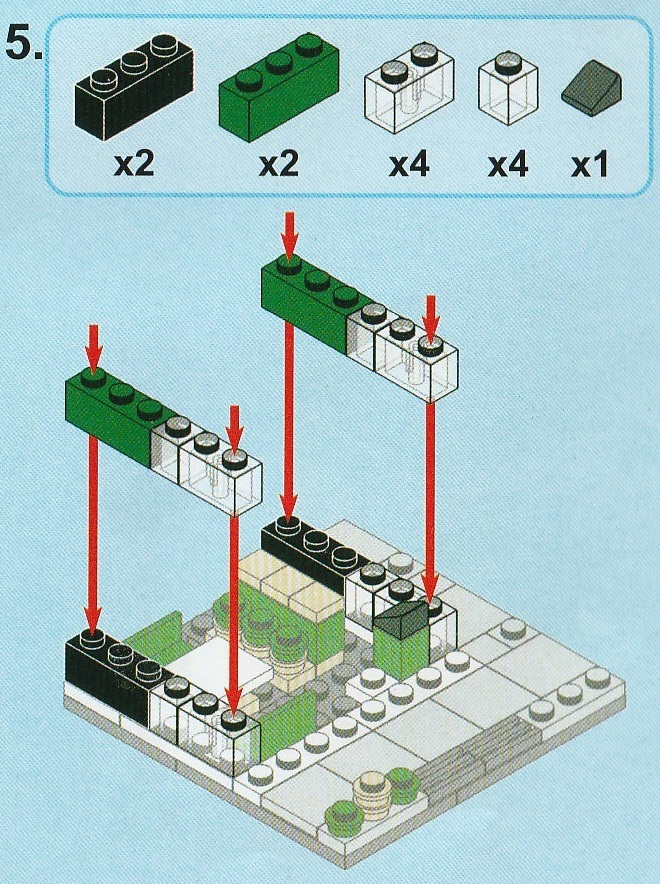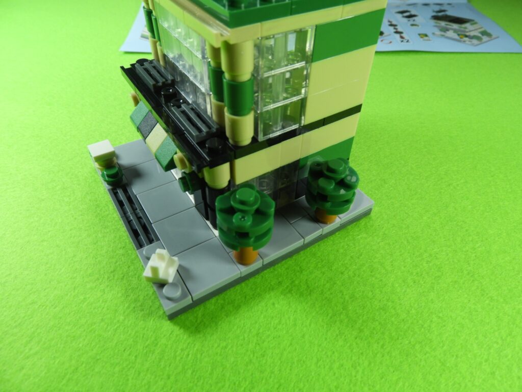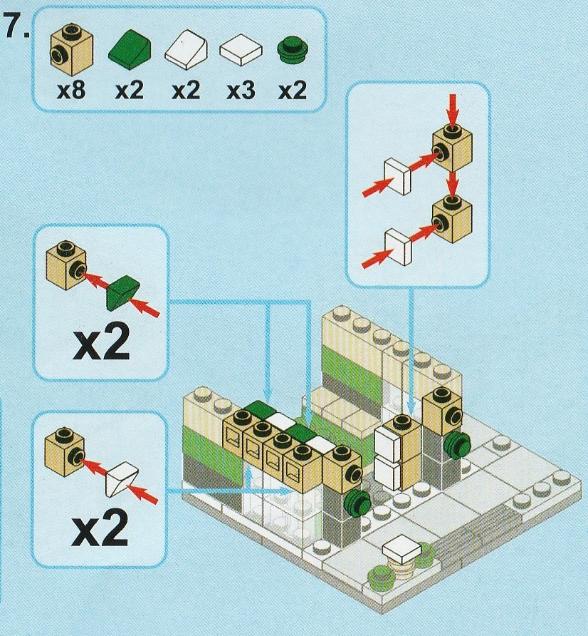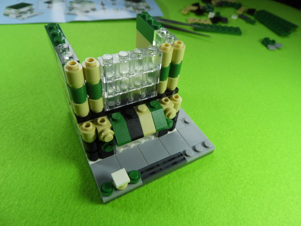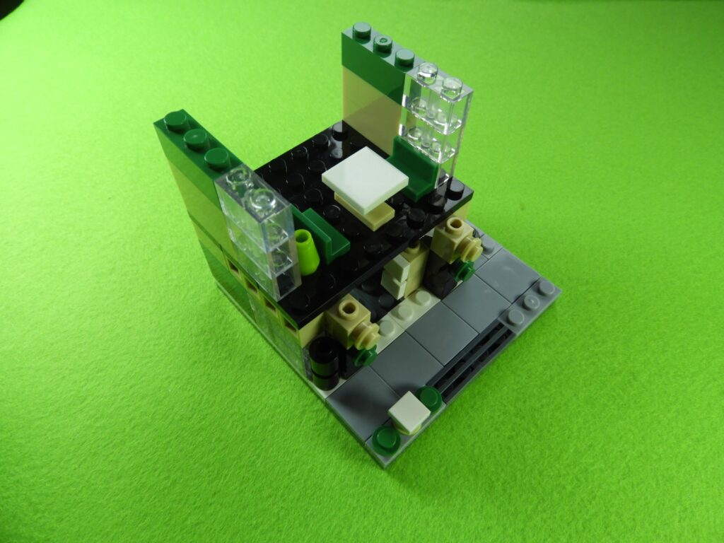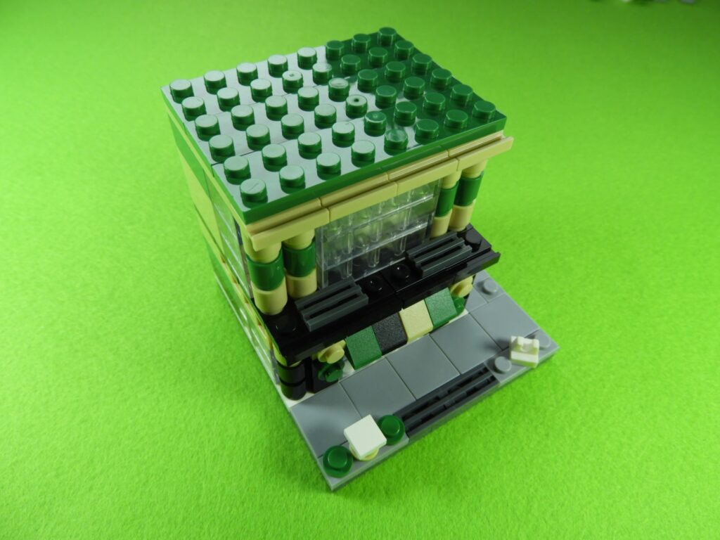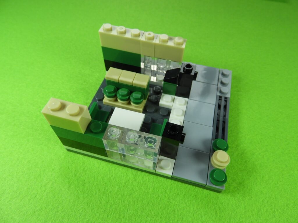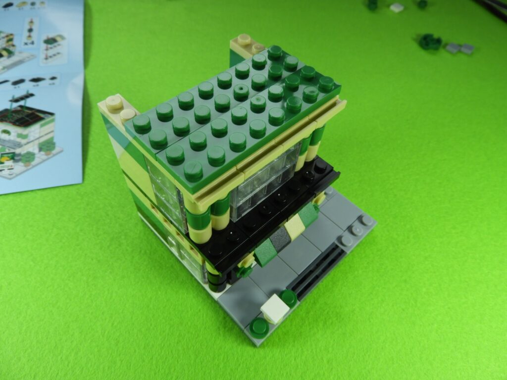 2.上記で組み立てたブロックをこの向きにして取り付けます。建物の正面側に上記で組み立てたブロックをのせます。最後に残り1枚の緑ブロックをのせると工程13番は完成します。