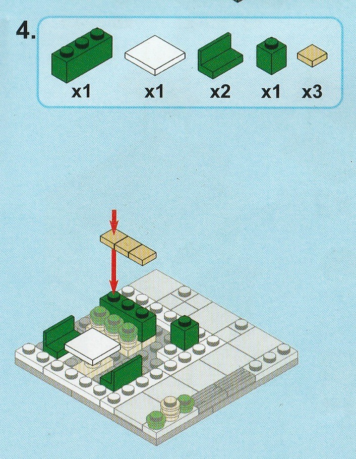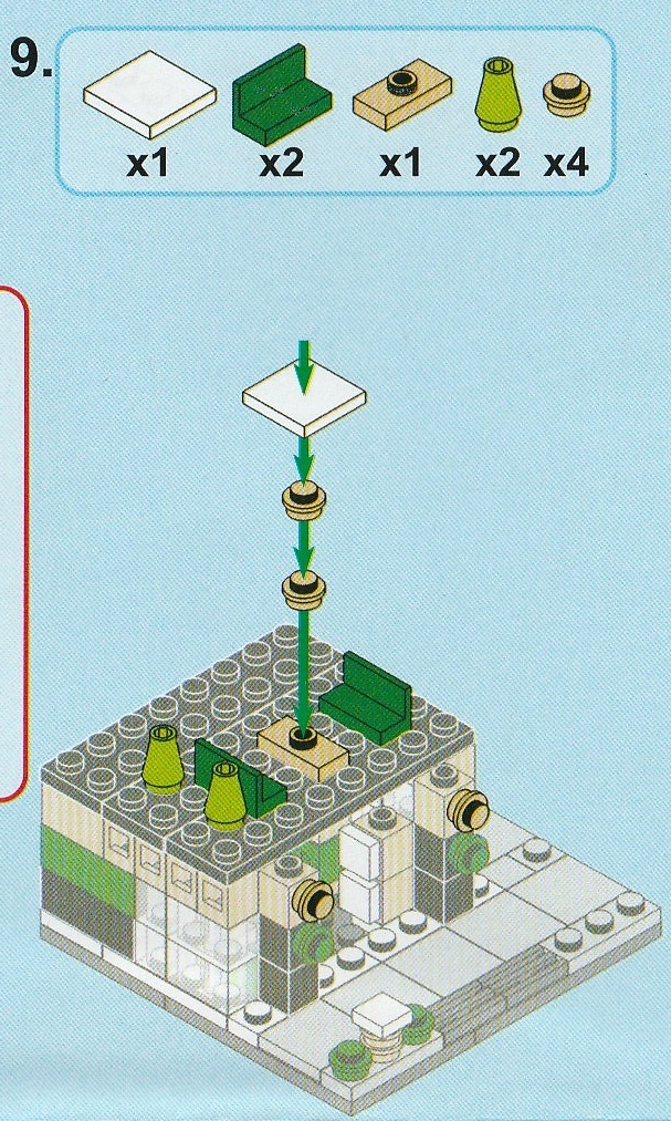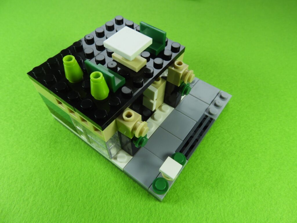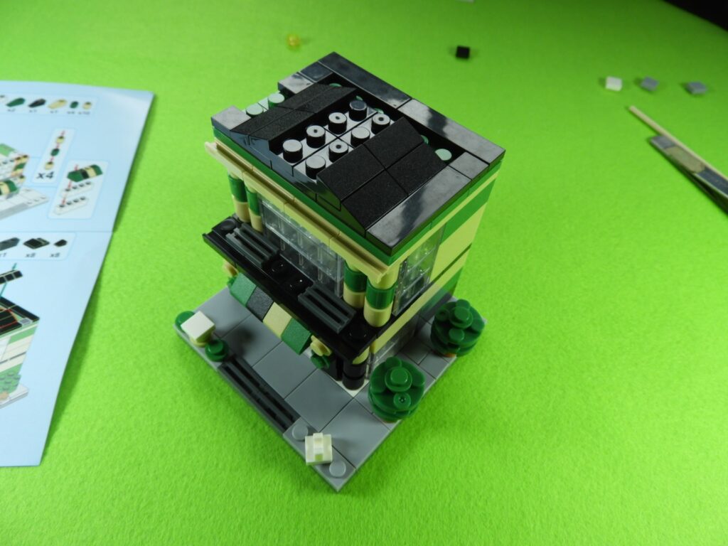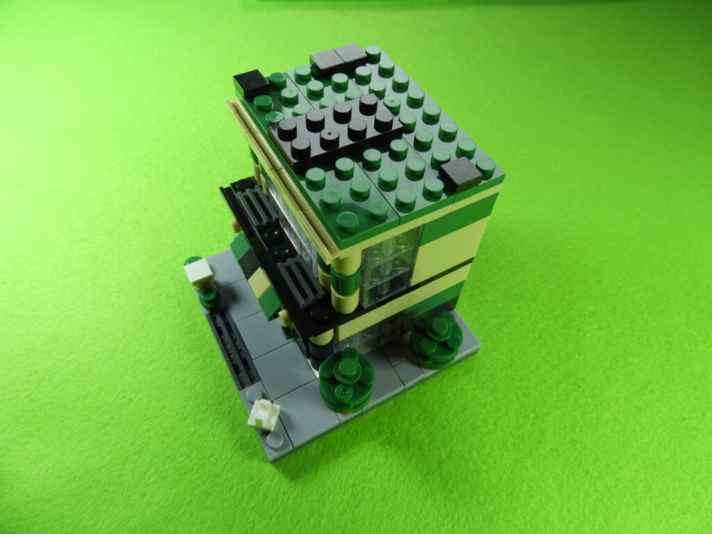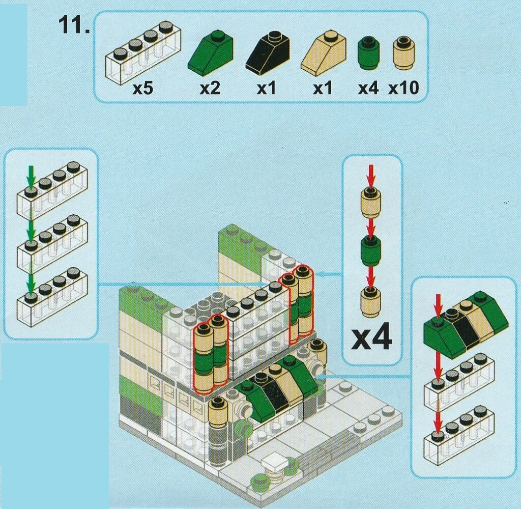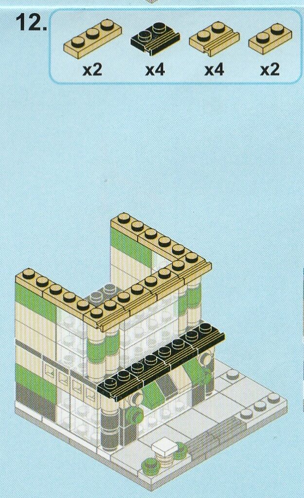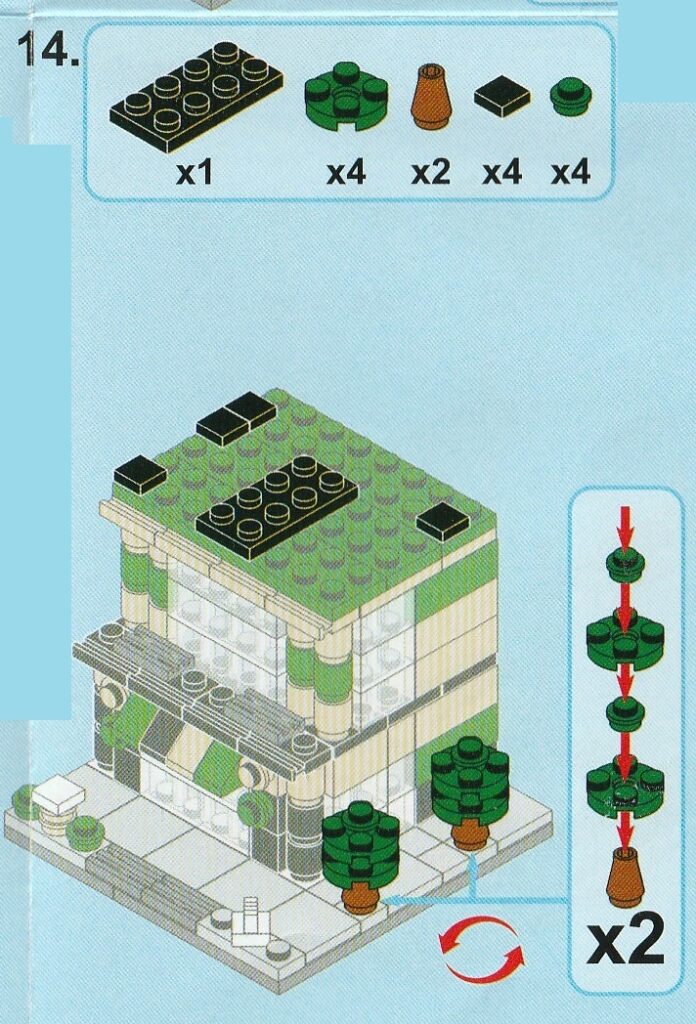 2.上記で組み立てたブロックをこの向きにして取り付けます。建物の正面側に上記で組み立てたブロックをのせます。最後に残り1枚の緑ブロックをのせると工程13番は完成します。