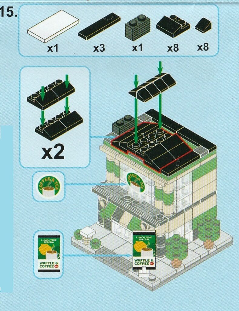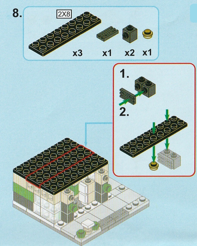 4.最後に、黒ブロック2個を取り付けると工程8番は完成します。これでカフェ1階の天井部分が出来上がりました。