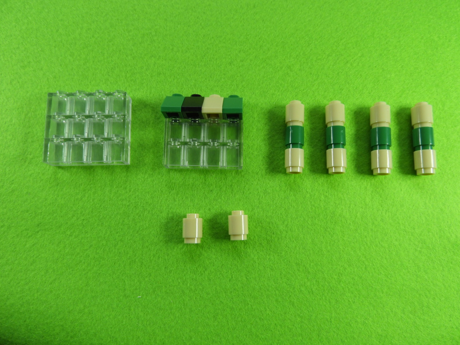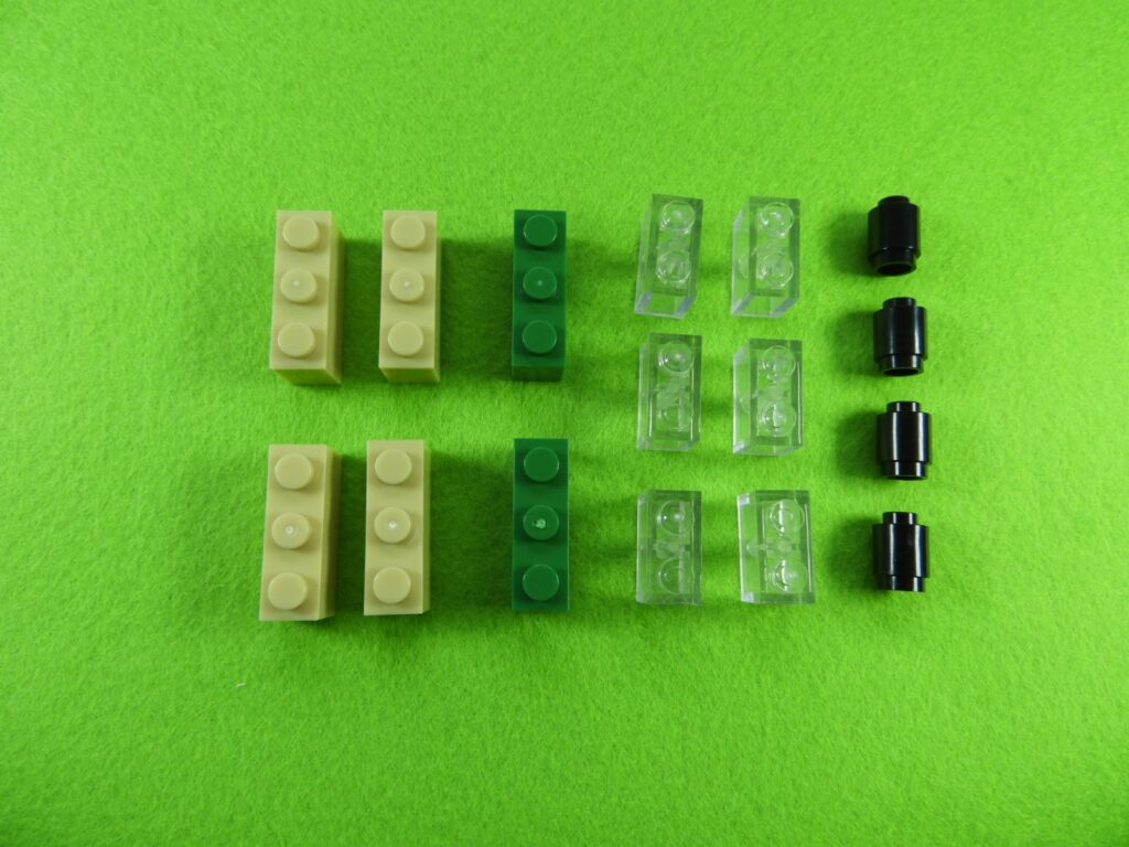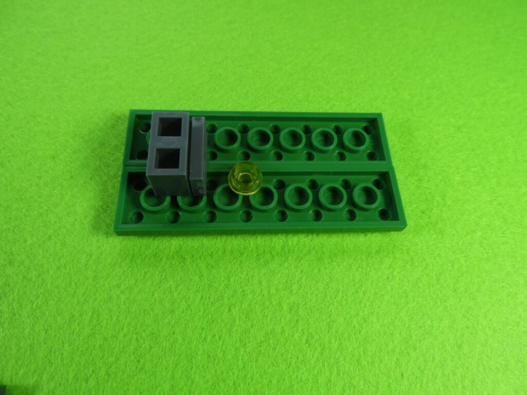 2.緑の長方形ブロック2個の下に、上記で組み立てたブロックと透明黄色ブロックを取り付けます。