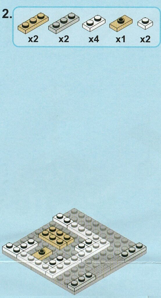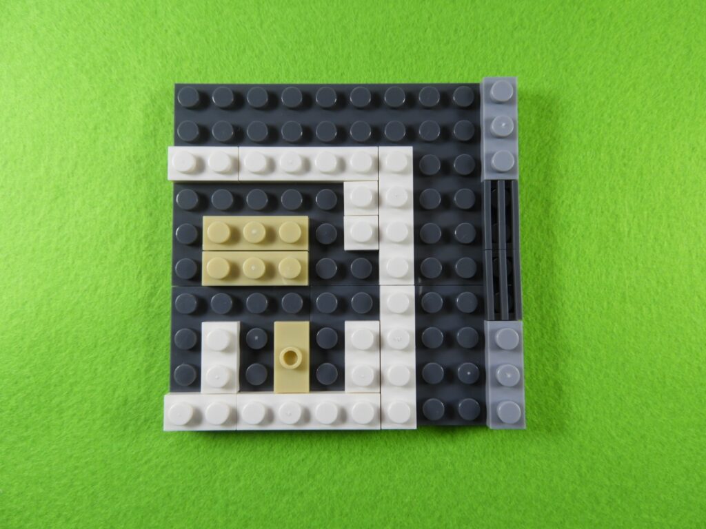 2.上記で組み立てたブロックを取り付け、ベージュブロック2個は正面両脇の黒ブロックの上にのせると工程11番は完成です。