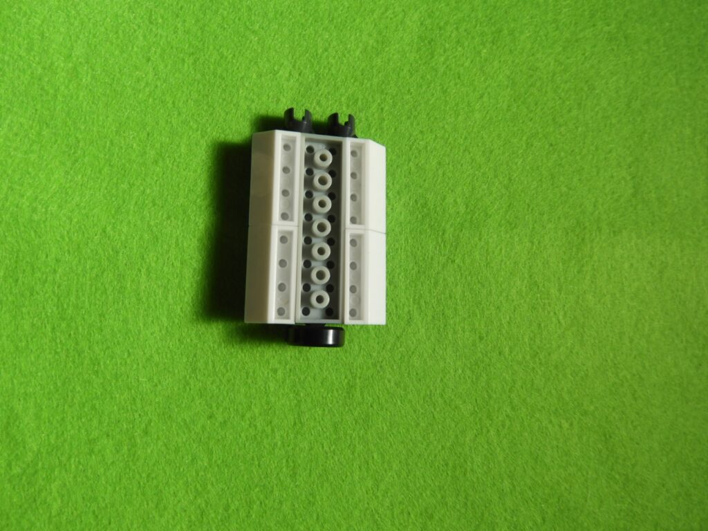 1.3段目のブロックの上に、2段目のブロックをのせます。タイヤみたいなブロックは、正方形の突起のある黒ブロックに差し込むとはまります。